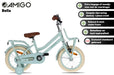 Touring around on a transport bike with front carrier like your big sister or mom? Now you can too with the AMIGO Bella! As the name suggests, a beautiful girls' bike with a classic transport design. This 14-inch children's bike has a matte, pastel green color, which is totally contemporary. The brown handles and saddle, combined with the cream tires and flowers on the chaincase, give it a chic finish. Already more advanced with exercise? Then try a lap without the side wheels. The pluses at a glance: [+] Smooth & effortless pedaling thanks to sealed bearings [+] Effective braking with back-pedal brake and V-brake [+] Long-lasting new value thanks to three double coating [+] Refined finish: stickers fixed under the lacquer [+] Stainless on the road thanks to stainless steel nuts and bolts [+] Tip! Combine with matching size bike crate or basket (not included) [-] No stand available when removing the side wheels (available separately) Smooth pedaling and safe through traffic The pedals at AMIGO go round easily, thanks to sealed bearings in the pedals. This allows you to pedal effortlessly and move forward easily, even with children's legs! The bike features a 1-piece crank, a solid choice for young cyclists. The entire pedaling system is neatly hidden behind a closed chaincase. Super safe and low maintenance. Finally, the stainless steel nuts and bolts ensure that your new bike will remain rust-free for years. A convincing braking system On our Bella you naturally go super fast, which of course requires effective and safe braking. With the coaster brake you stand still immediately. Do you want to brake more specifically or reduce speed a little? Then use the V-Brake on the aluminum front rim, which is a lot more powerful than a regular pinch brake. In addition to a lubricated ride, you also want to feel safe on the bike. With the help of the reflectors at the front, rear, on the spokes and even on the pedals, you will be highly visible! ROBUST, even in the long run! The strong steel frame and steel fenders are coated with no less than three coats of paint, which means the bike stays beautiful even when falling down and standing up. Even the decals are covered with paint, so the design remains unaffected year after year On top of that, both the handlebars and the saddle are adjustable in height. A durable idea, because you can keep riding around on this 14 inch girls bike (with frame size of 24 centimeters) for a long time. Suitable for ages between three and five. AMIGO, ready to move AMIGO gets you moving! With products with a fun and fresh design, at a surprisingly low price. The AMIGO collection consists of (electric) bikes, bike parts and accessories, scooters, skates, balance bikes and trampolines. Because we develop AMIGO products ourselves and buy them directly from the factory, we can guarantee not only good quality, but also a good price! So AMIGO also makes your free time just that little bit more fun. AMIGO, ready to move! General specifications: Color: green Gender: girls Material frame: steel Material rims: aluminum Material fenders: steel Material front carrier: steel Tires: pneumatic tires (cream) Age indication: 3 to 5 years Weight: approx. 11 kg Specifications sizes: Wheel size: 14 inches Frame size: 24 cm Suitable for body height: 98-108 cm Adjustable saddle height: yes Handlebar adjustable in height: yes Brake specifications: Front brake type: V-Brake Rear brake type: back-pedal brake Lighting specifications: Lighting front: reflector Lighting rear: reflector Specifications accessories: Mudguards: yes, above front and rear wheel Side wheels: yes, detachable Chain guard: closed Carrier: yes Front carrier: yes Bell: yes