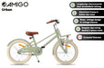 Also crazy about the vintage look of the AMIGO Urban? The girl's bike looks nostalgic but is technically very modern. For example, the green frame is made of lightweight aluminum. Exceptional for a children's bike! The pastel color has a subtle glossy finish and is combined with classic silver hardware such as the retro headlight. But the brown saddle, handles and cream-colored tires are also a good match. On the 18-inch transport bike with front carrier you can take all your (school) stuff with you! The pluses at a glance: [+] '3-piece crank' for the smoothest riding experience [+] Effective braking power with back-pedal brake and V-Brake [+] Long-lasting new value thanks to three double coating [+] Refined finish: stickers fixed under the lacquer [+] Stainless on the road thanks to stainless steel bolts and nuts [+] Ring lock and stand included Park anywhere safely and quickly! [+] Aluminum frame is lighter than steel and more resistant to rust [+] Tip! Combine with matching bike crate or basket (not included) Unimpeded by traffic Thanks to the 3-piece crank, pedaling movements feel smooth like you can't experience on any other children's bike. Such a 3-piece crank consists of separate parts, making movements more streamlined than with a single piece crank that is forged in one piece. In addition, the 3-piece crank also has a much longer lifespan. The entire pedal system is neatly hidden behind the gun-type chaincase. Finally, the stainless steel bolts and nuts ensure that your new bike will remain rust-free for years to come. A convincing brake system On our Urban you naturally go super fast, which of course requires an effective and safe braking result. With the back-pedal brake you stand still immediately. Would you like to brake more specifically or reduce speed a little? Then use the V-Brake on the aluminum front rim, which is a lot more powerful than a regular pinch brake. In addition to a lubricated ride, you also want to sit on your bike feeling safe. With the help of the front and rear battery lights, reflectors on the spokes and even on the pedals, you'll be highly visible! Psstt. on this inch size is a stand and a ring lock mounted, so you can park the bike anywhere, safely and quickly. ROBUST, also in the long run! The lightweight aluminum frame and steel fenders are coated with no less than three layers of paint, so the bike stays beautiful even when falling down and standing up. Even the decals are covered with paint, which keeps the design intact year after year On top of that, both the handlebars and the saddle are adjustable in height. A durable idea, because you can ride around on this 18 inch girls bike (with frame size of 27 centimeters) for a long time. Suitable for ages between five and seven. AMIGO, ready to move AMIGO gets you moving! With products with a fun and fresh design, at a surprisingly low price. The AMIGO collection consists of (electric) bikes, bike parts and accessories, scooters, skates, balance bikes and trampolines. Because we develop AMIGO products ourselves and buy them directly from the factory, we can guarantee not only good quality, but also a good price! So AMIGO also makes your free time just that little bit more fun. AMIGO, ready to move! General specifications: Color: green Gender: girls Material frame: aluminium Material rims: aluminum Material fenders: steel Material front carrier: steel Tires: pneumatic tires (cream) Age indication: 5 to 7 years Weight: approx. 11.2 kg Specifications sizes: Wheel size: 18 inches Frame size: 27 cm Suitable for body height: 110-123 cm Saddle height: 59 cm (in the lowest position, measured from the ground) Adjustable saddle height: yes Height-adjustable handlebar: yes Brake specifications: Front brake type: V-Brake Rear brake type: back-pedal brake Lighting specifications: Lighting front: retro headlight (battery lighting) Lighting rear: battery lighting Reflectors: yes, on the spokes and pedals Specifications accessories: Mudguards: yes, above front and rear wheel Chain guard: pistol type Bike stand: yes Front carrier: yes Bell: yes Lock: ring lock