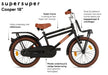Dream big! You can on the Supersuper Cooper 18 inch children's bike. With this sturdy go-getter you can take on the whole world. Strong enough for a big tour and a battle with the wind. With the Cooper you can confidently take on the world. Let's go, the world is #supersuper! Tough & Practical This sturdy matte black boy's bike has a vintage look. The brown colored handles, tires and saddle match totally in style! In addition, the children's bike has many features such as a luggage carrier and a front carrier, reflectors, bike stand and bell. The (first) bike for your child Learning to ride a bike and keeping your balance at the same time can be quite difficult. On the strong steel frame of this children's bike you will find your stability thanks to the detachable side wheels. The closed chaincase prevents dangerous situations such as clinging clothes or trapped fingers. Already a little more advanced with practice? Then you can increase the speed. Fast, Faster, Fastest! Give a ring to the bike bell, ZOEF.... There you go! Effortlessly you cycle past everyone, but watch out! Will you hold back at the traffic light? Don't worry, the back-pedal brake on the rear wheel lets you stop quickly and easily. To reduce speed, you can also use the V-Brake on the front wheel. A customized children's bike Sometimes you can't keep up with how fast children grow. But rest assured both the saddle and handlebars are adjustable in height, so you can easily adjust the bike to all body proportions. This children's bike with wheel size 18 inches (frame size of 30 centimeters) is suitable for ages between five and seven. Please note, including training wheels! General specifications: Color: matt black Color name: Matt Black Gender: boys Material frame: steel Material rims: aluminum Tires: pneumatic tires (brown) Age indication: 5 to 7 years Weight: approx. 13 kg Specifications sizes: Wheel size: 18 inches Frame size: 30 cm Suitable for body height: 116-122 cm Adjustable saddle height: yes Handlebar adjustable in height: yes Brake specifications: Front brake type: V-Brake Rear brake type: back-pedal brake Lighting specifications: Lighting front: reflector Lighting rear: reflector Specifications accessories: Mudguards: yes, above front and rear wheel Side wheels: yes, detachable Chain guard: closed Stand: yes Carrier: yes Front carrier: yes Bell: yes