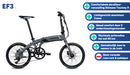 Chrisson EF3: The Compact Powerhouse on the Go Discover the Chrisson EF3, the ideal folding bike that seeks mobility, convenience and performance in one stylish package. This electric folding bike is designed to get you from a to b effortlessly, whether you're commuting to work or taking a weekend trip. With the Chrisson EF3, you are always flexible, no matter your destination. Chrisson EF3 The Chrisson EF3 stands out for its sleek, gray design and compact size, perfect for city trips and easy to fold for transport or storage. The lightweight aluminum frame makes this folding bike not only durable, but also easy to carry. The 20-inch wheels ensure a stable ride, while the fixed stem provides instant control and maneuverability in city traffic. Powerful Support in a Compact Form Despite its compact size, the Chrisson EF3 offers powerful performance thanks to the 360Wh battery, which is neatly integrated into the frame. With an average range of 50 kilometers, you can cover longer distances with ease. Ananda's rear-wheel motor and rotation sensor provide smooth and reliable pedal assistance, allowing you to effortlessly conquer any incline and distance. The bright LCD display provides you with all the information you need about your ride, keeping you fully informed at all times. Efficiency and Safety in One With 9 gears provided by the Tourney derailleur, you always have the right gear at hand, no matter the terrain. The 5 support modes help you through all conditions. The mechanical disc brakes on both the front and rear offer reliable and powerful stopping power, ensuring you can always stop safely, even in wet conditions. Although the bike does not have a built-in lock, you can easily add your own for added security. Practical and Flexible The Chrisson EF3 is designed for those who value mobility and flexibility. The bike folds easily, making it ideal for people who often travel on public transportation or have limited storage space. With the integrated battery lighting, which meets StVZO standards, you will be highly visible and safe on the road even in the dark. That's excellent! We supply Chrisson bikes directly from the factory, so spare parts are always quickly available and any repairs can be carried out smoothly. In addition, you benefit from a 2-year manufacturer's warranty. Specifications general: Brand: Chrisson Brand line: EF3 Frame color: Gray Gender: Ladies Type of Bike: Folding bike Frame material: Aluminum Material rim: Aluminum Wheel size: 20 inch Frame size: 32 cm Handlebar stem: Fixed Seat post suspension: No Suspension fork: No Gear specifications: Gears: 9 Gear type: Derailleur, Tourney 9 Number of assistance modes: 5 Drive type: Chain Bike specifications: Drive position: Rear wheel Type of motor: Ananda Pedal assistance sensor type: Rotation sensor Battery Specifications: Battery position: In frame Battery capacity: 360Wh Removable battery: Yes Range: Β± 50 KM (average consumption) Range mix/max: 35-90 km Max. speed: 25 km p/h Display specifications: Display type: LCD Brake Specifications: Front brake type: Mechanical disc brake Rear brake type: Mechanical disc brake Lighting Specifications: Front lighting: Bicycle battery (StVZO approved) Rear lighting: Bicycle battery (StVZO approved) Accessories Specifications: Luggage carrier: No Lock: No lock included Manufacturer's warranty: 2 years